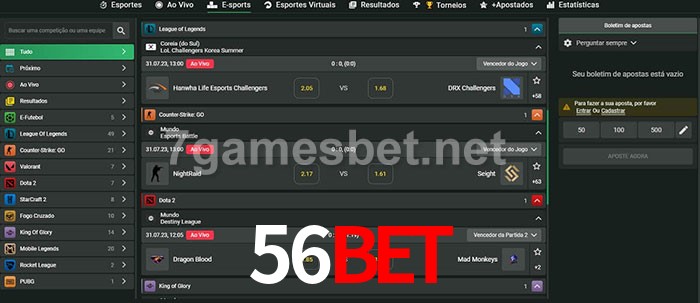 O 56bet oferece uma grande seleção de opções de apostas em e-sports com probabilidades competitivas